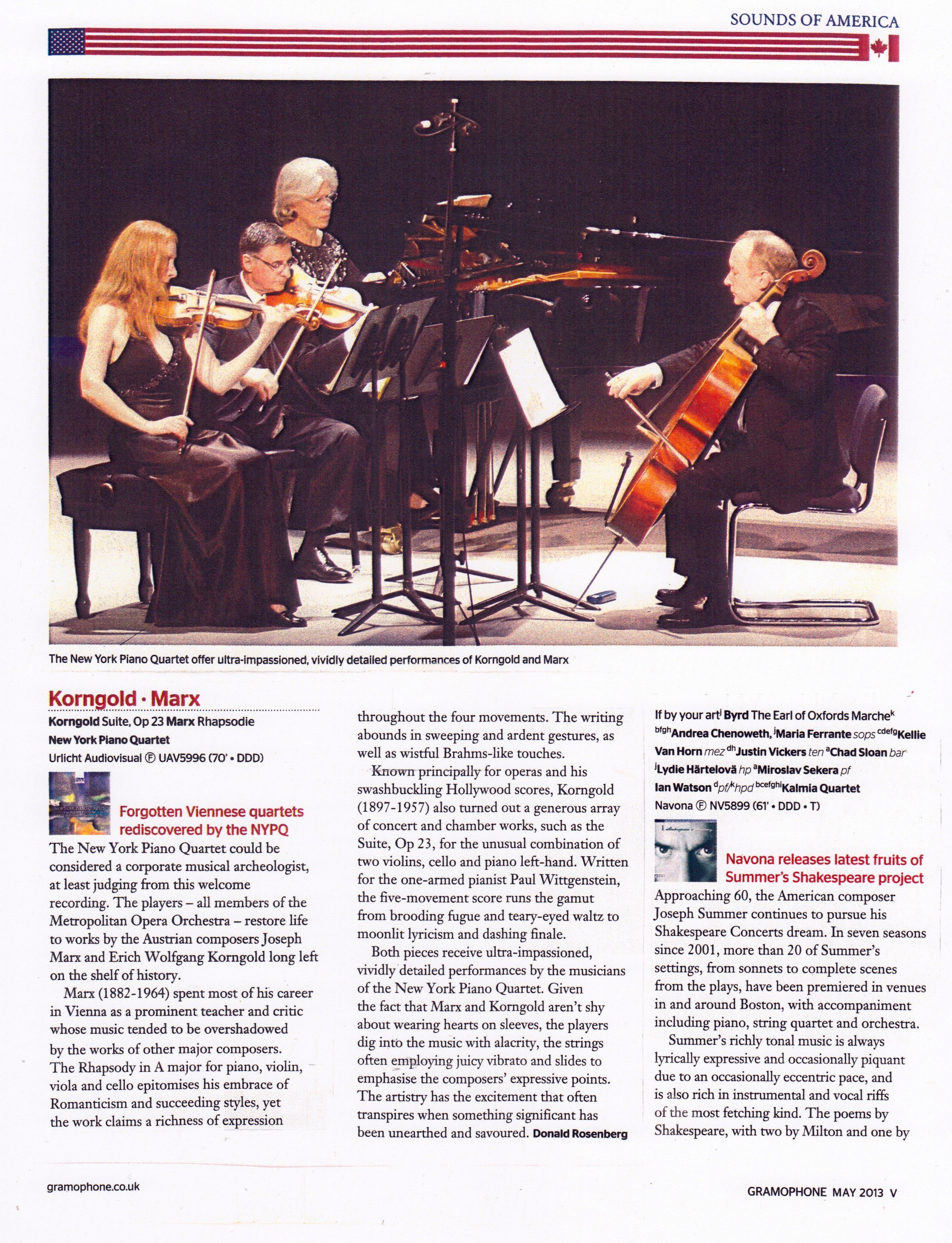 We were ecstatic when the May 2013 issue of the prestigious Gramophone Magazine praised our CD recording for the Urlicht label as “ultra-impassioned, vividly detailed performances of Korngold and Marx”, complete with a huge photo of our group on half a page. That this terrific review is by the highly-respected critic and author Donald Rosenberg, means so much to us, and to read his opinion that our New York Piano Quartet has restored life to these two works is indeed very rewarding.